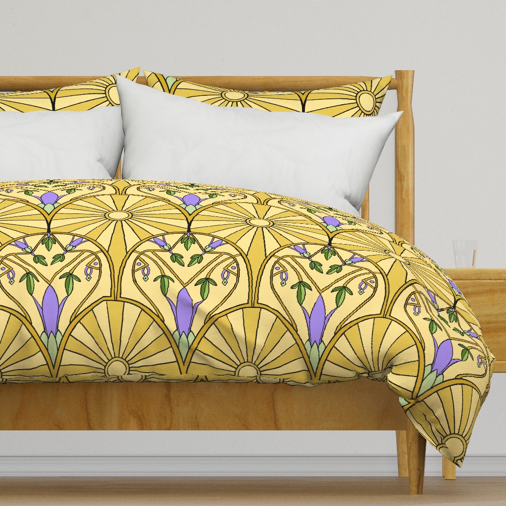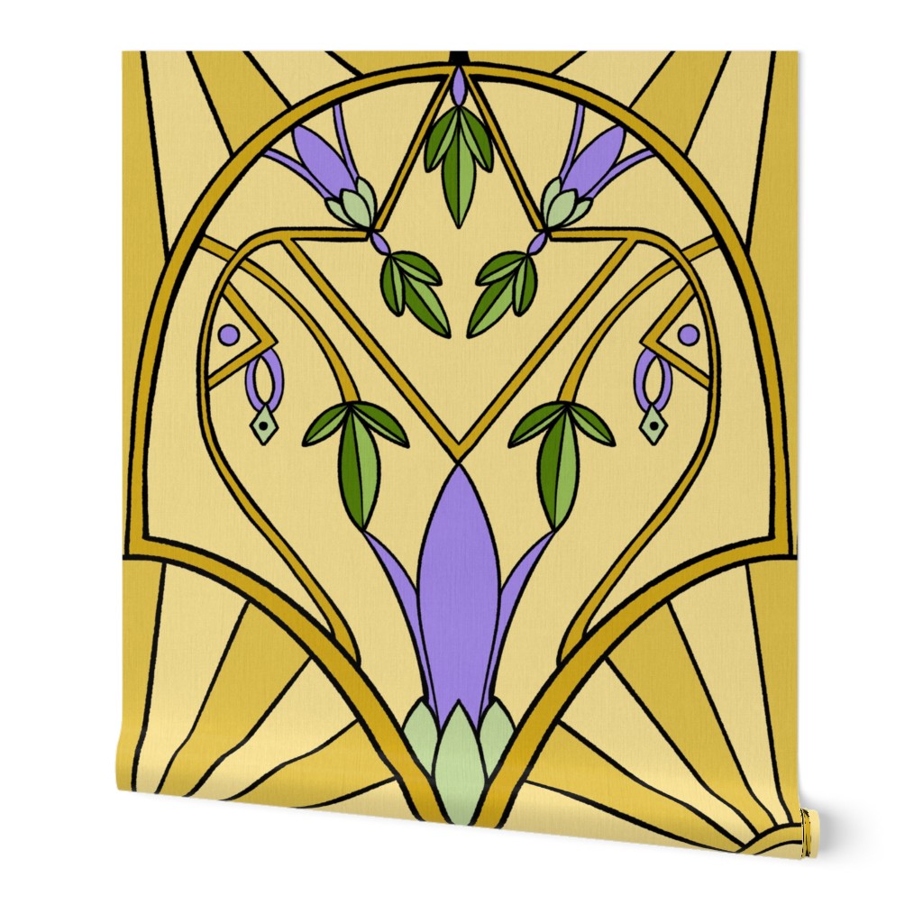 Home Decor with Roaring 20s shine in a vibrant yellow sunburst surrounding bold purple, symmetrical tulips in sleek lines that radiate extravagance