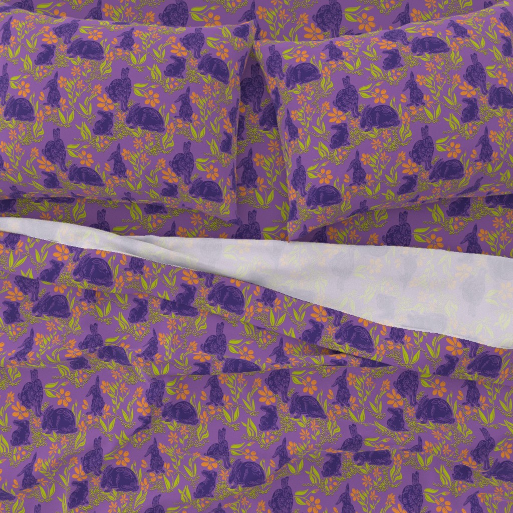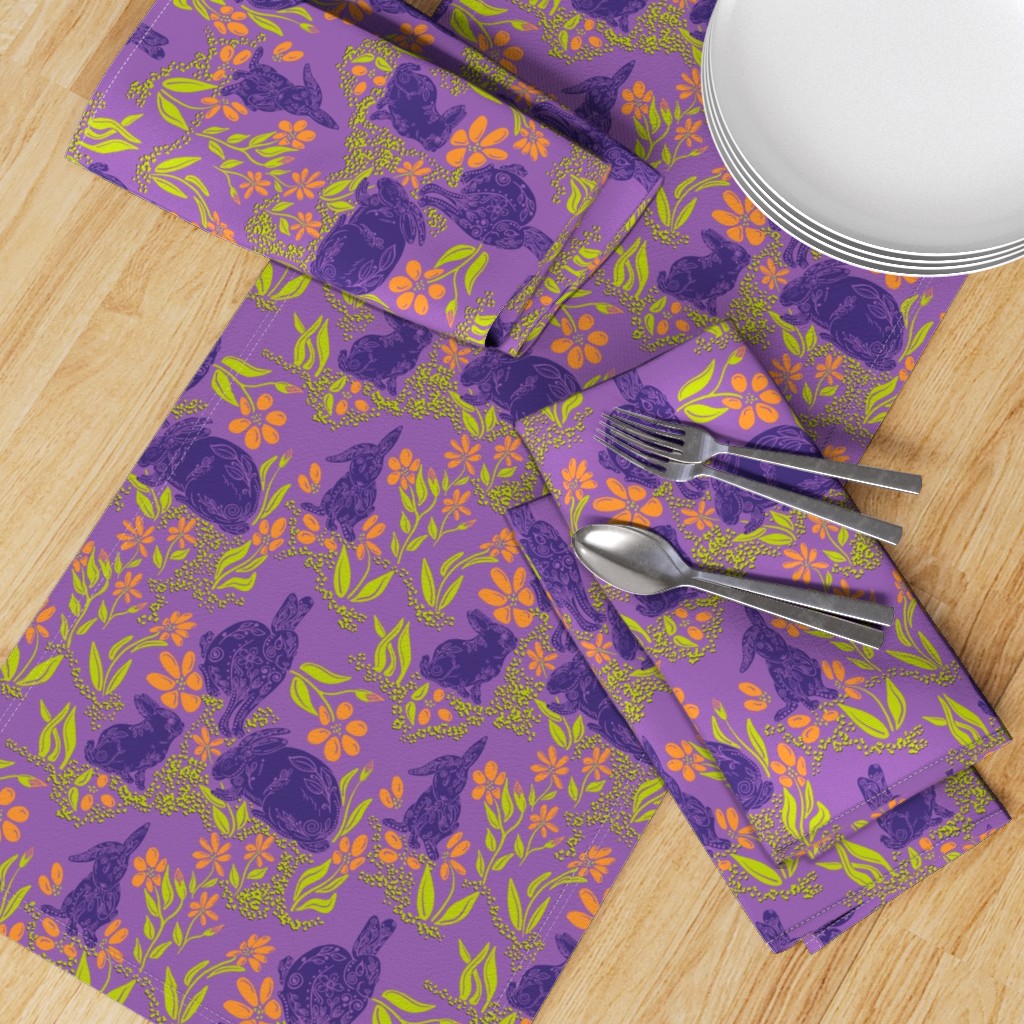 Folk art rabbits enjoy daisies in my garden; They hide in the vibrant, neon florals —do you see them munching petal by petal? Fun for family room and DIY Kid projects.