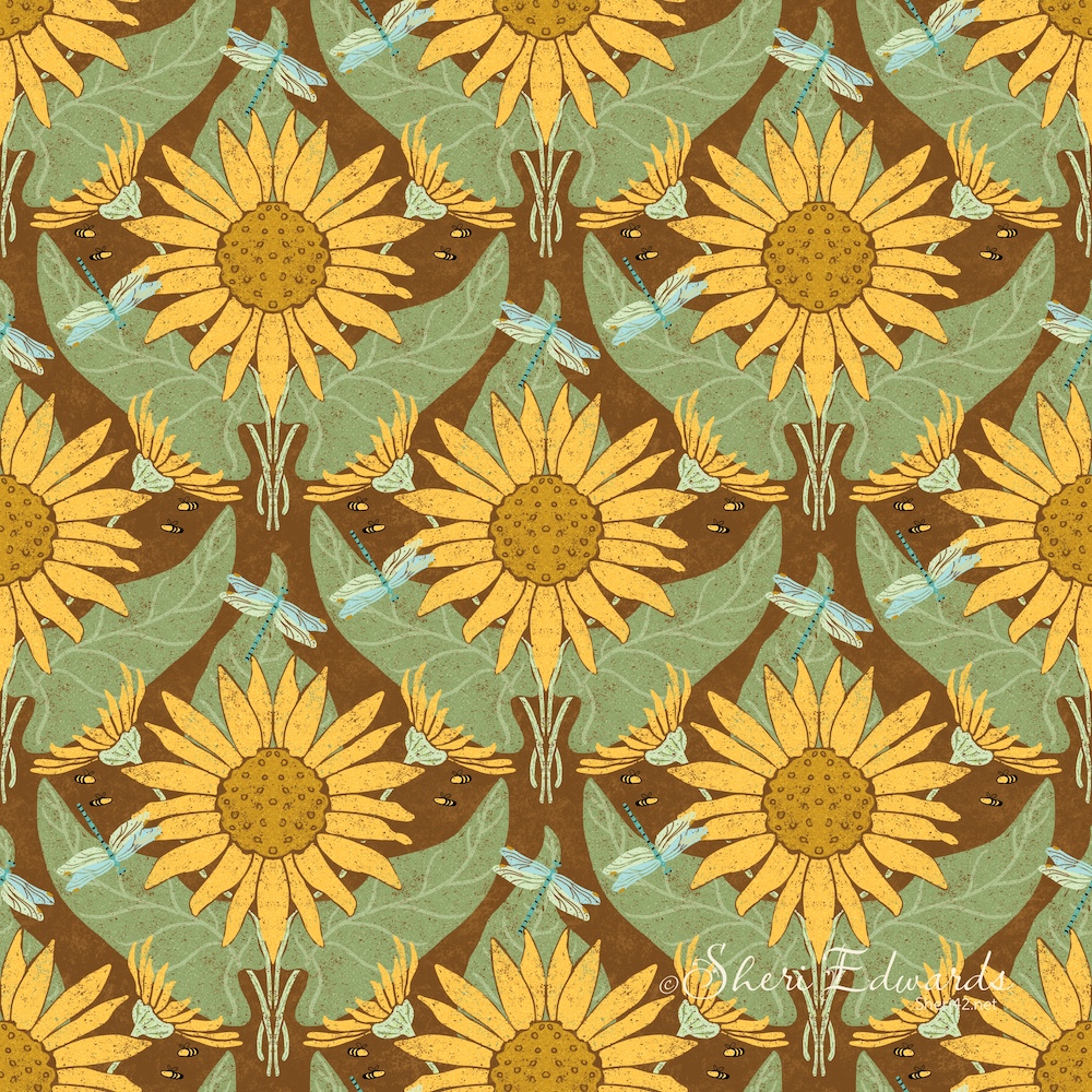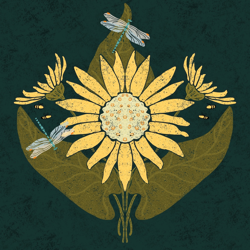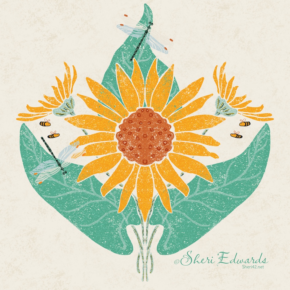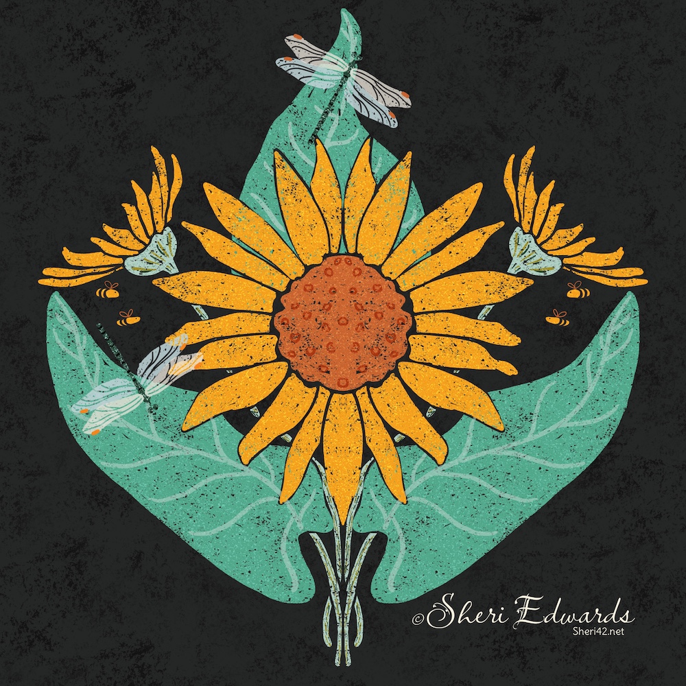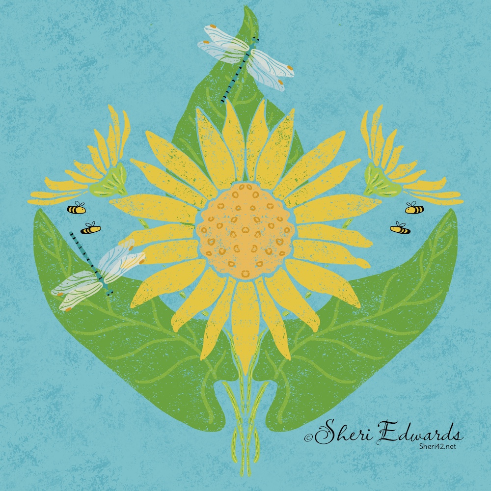 I thought I’d create it with twelve of the wildflowers of our area, starting with arrowleaf balsamroot. I broke the symmetry with one leaf and the dragonflies. I’m pretty pleased with the results.
