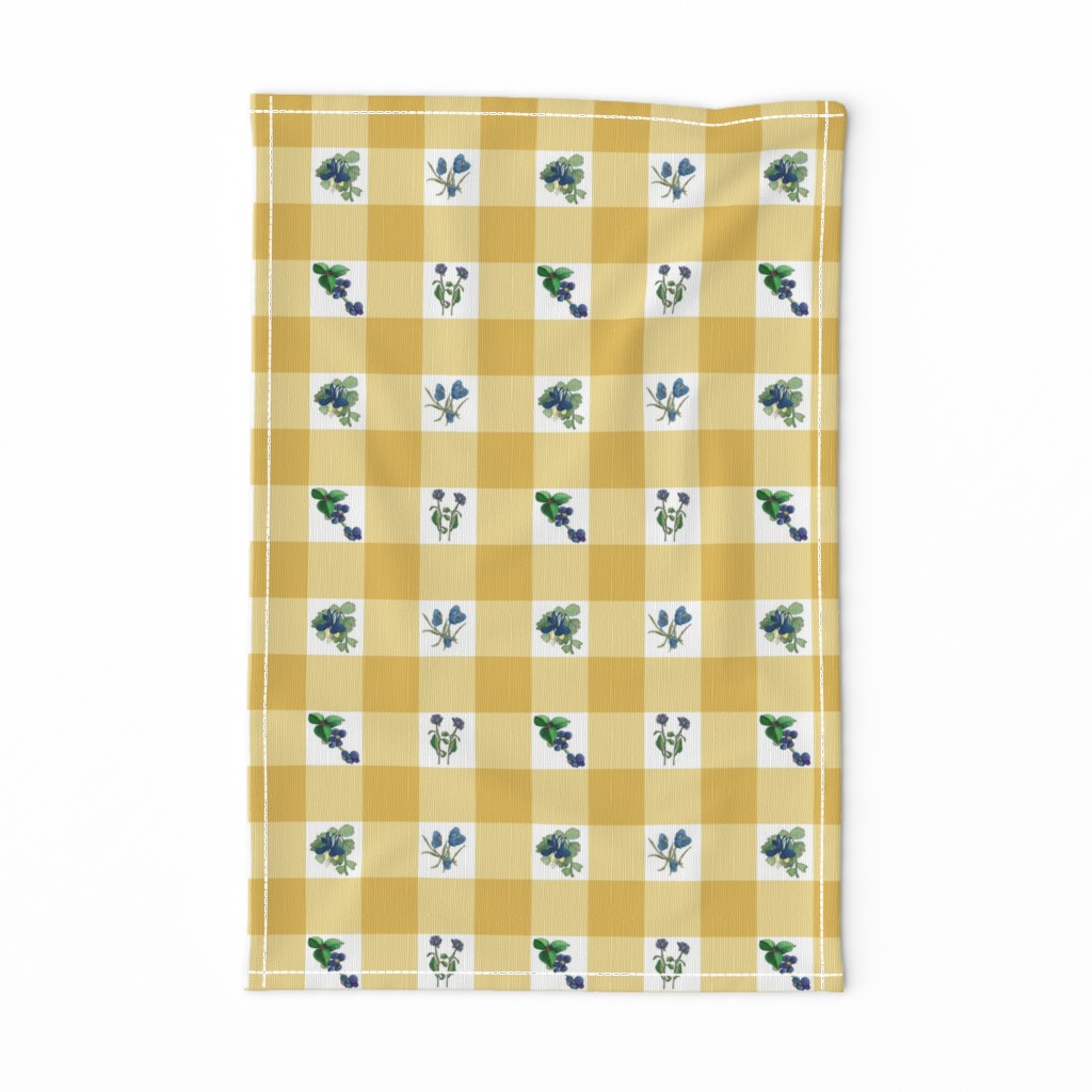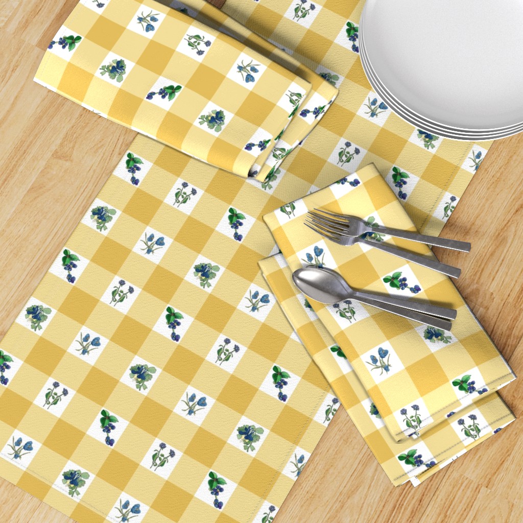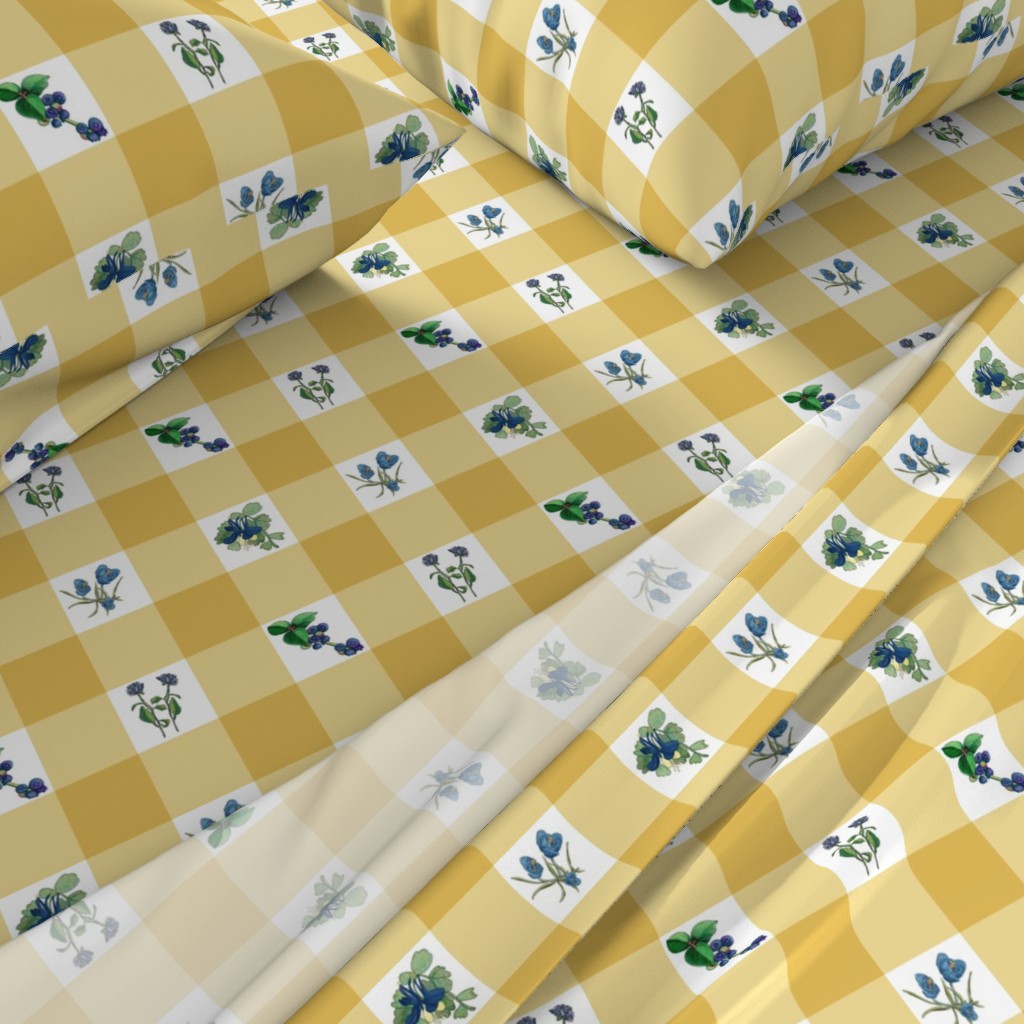 Spread a country checked tablecloth in colors of warm wheat and denim blue— retro florals of crocus and peony perfect for a prairie picnic— inside or out! Click an image to find on Spoonflower. I’m ordering the rectangular table cloth. I can hardly wait for the order to arrive. You can find this pattern in my Floral Delight collection.